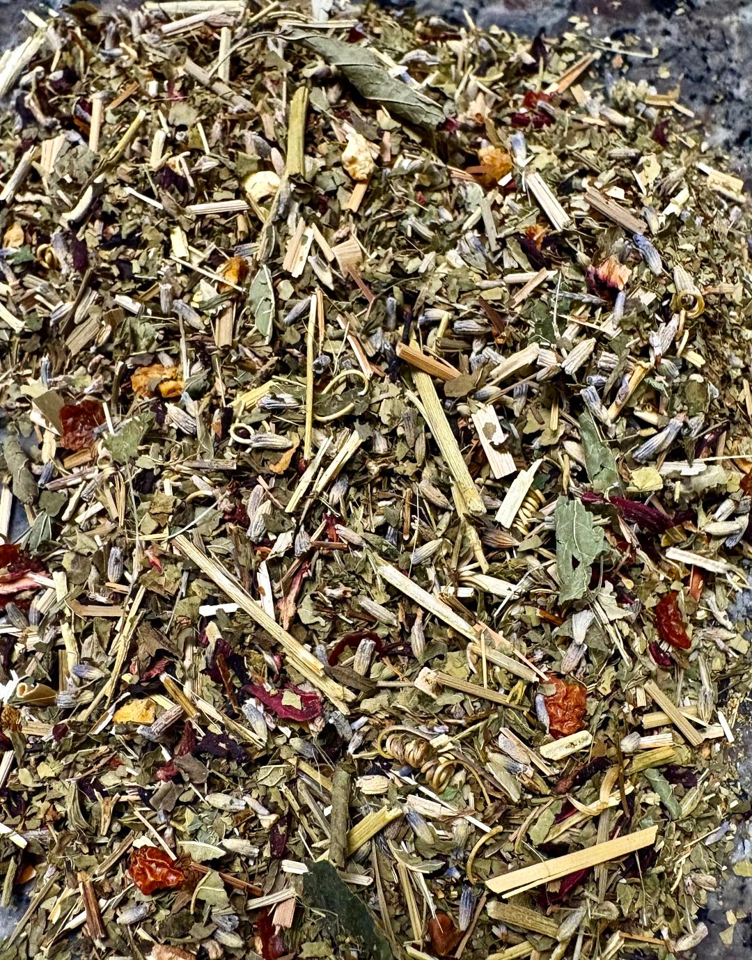 Ultimate Stress Tea contains passionflower, lemon balm, lavender, and spearmint, carefully blended to help calm the mind and ease tension. These soothing herbs are traditionally used to promote relaxation and support a balanced mood, making this tea ideal for unwinding after a stressful day.